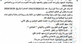 تنهي إدارة معهد الإمام نافع وفروعه الخاص للتعليم العتيق إلى علم تلاميذ وتلميذات وطلبة وطالبات المعهد وفروعه المسجلين بالمعهد وفروعه للموسم الدراسي والجامعي 2020/2021. أنه بناء على المراسلة الوزارية: عدد 133/2020/I/1541 الصادرة بتاريخ: 20/10/2020 الواردة بالإذن في التعليم الحضوري. واعتبار للوضعية الصحية ببلادنا وما تتطلبه من الأخذ بشروط السلامة والإجراءات ...