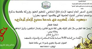 في موضوع: “جهود علماء المغرب في خدمة صحيح الإمام البخاري” تحت شعار ” يحمل هذا العلم من كل خلف عدوله ينفون عنه تحريف الغالين وانتحال المبطلين وتأويل الجاهلين “ بمشاركة ثلة من العلماء والأساتذة الباحثين وذلك يومي: 3-4 أبريل 2018م ابتداء من الساعة 9:00 صباحا بقاعة المحاضرات والندوات بالمعهد