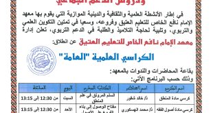 تنهي إدارة معهد الإمام نافع الخاص للتعليم العتيق وفروعه إلى علم كافة أطرها وطلابها أن: عطلة منتصف السنة الدراسية….