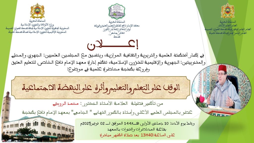 في إطار أنشطته العلمية والتربوية والثقافية الموازية، وبتنسيق مع المجلسين العلميين: الجهوي والمحلي والمندوبيتين: الجهوية والإقليمية للشؤون الإسلامية، تنظم إدارة معهد الإمام نافع الخاص للتعليم العتيق وفروعه بطنجة محاضرة علمية في موضوع: ” الوقف على التعلم والتعليم وأثره على النهضة الاجتماعية”