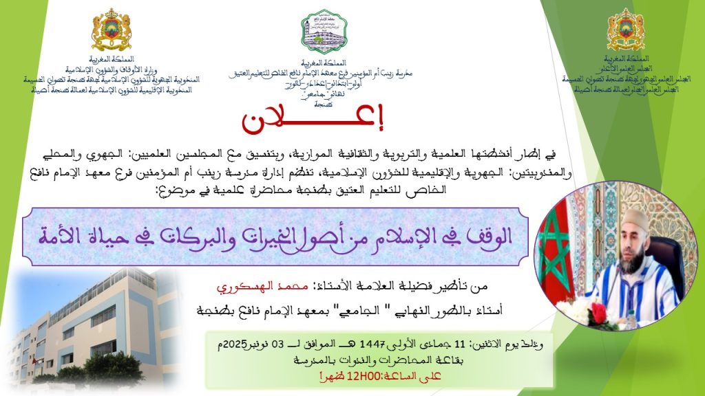 في إطار أنشطتها العلمية والتربوية والثقافية الموازية، وبتنسيق مع المجلسين العلميين: الجهوي والمحلي والمندوبيتين: الجهوية والإقليمية للشؤون الإسلامية، تنظم إدارة مدرسة زينب أم المؤمنين فرع معهد الإمام نافع الخاص للتعليم العتيق بطنجة محاضرة علمية في موضوع: ” الوقف في الإسلام من أصول الخيرات والبركات في حياة الأمة “…